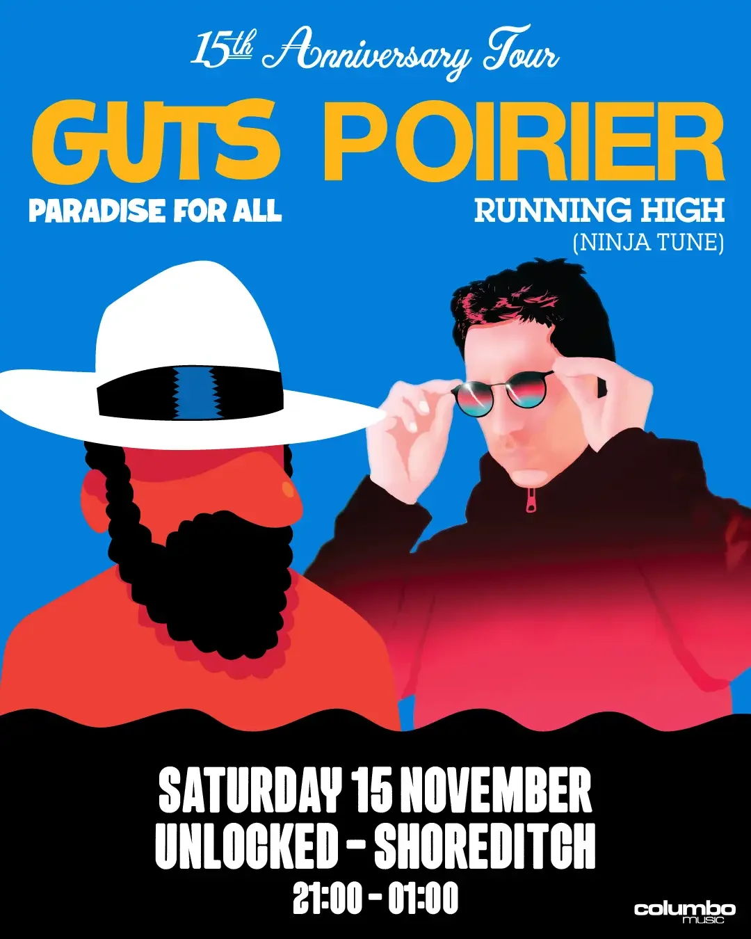 Guts & Poirier team up for a European tour to celebrate the 15th anniversary of their respective iconic albums together; 'Paradise For All' & 'Running High'. Join us at London's brand new UNLOCKED, in the heart of Shoreditch, for an unmissable celebration of jazz, afro-cuban, and latin dance music from two of Europe's most cherished musicians of the last three decades. From 9pm until late, expect a soulful, energetic, and liberating exploration of sound, dance, and connection. “An unmissable experience [...] it’s impossible not to move.” - Strand Magazine