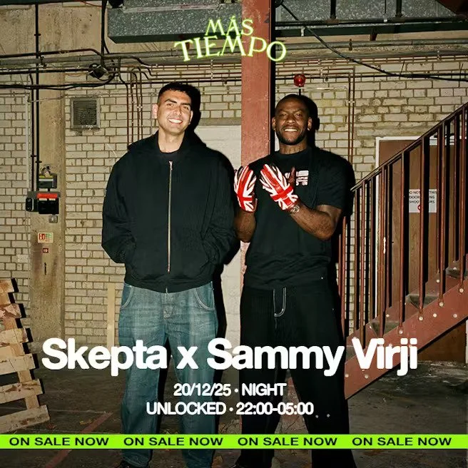 Back to All Events Mas Tiempo - sold out Saturday 20 December 2025 22:00 22:00 Google Calendar ICS SOLD OUT - SIGN UP FOR UPDATES It wouldn't be a Más Tiempo party without a serious lineup.Skepta & Sammy Virji link up for our annual London gathering this December, going B2B exclusively at Unlocked Shoreditch for the night edition of our final London party of the year. SOLD OUT - SIGN UP FOR UPDATES